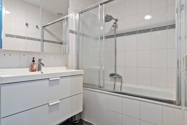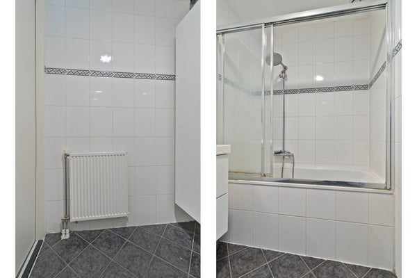 - De goed onderhouden en betegelde badkamer is voorzien van een ligbad met douche en wastafelmeubel.