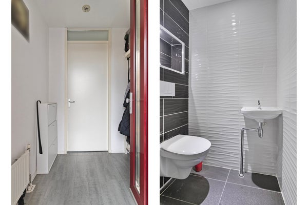- Geheel betegelde toiletruimte met zwevend toilet en fonteintje;