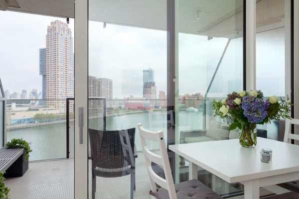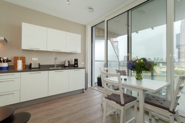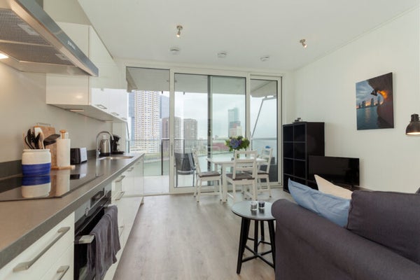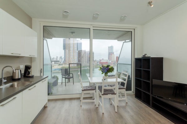 Dit luxe studio-appartement op de zevende verdieping van het iconische Fenix 1 biedt volop lichtinval en een riant balkon met grandioos uitzicht op de Rijnhaven. Het goed ingedeelde 2-kamer appartement, volledig instapklaar, is gelegen in een gerenoveerde historische loods uit 1949. Met een woonoppervlakte van 40 m² is het uitgerust met moderne voorzieningen inclusief een open keuken met AEG-inbouwapparatuur en een verzorgde badkamer met ruime douche. Door een slimme indeling is de slaapkamer deels afgescheiden van de rest. Het appartement heeft een interne bergingskast en een aparte berging in het souterrain. Gelegen in het levendige Katendrecht, is het appartement nabij uitgaansgelegenheden en openbaar vervoer. Er is tevens toegang tot een gezamenlijke binnentuin en een fietsenstalling. Energielabel A garandeert lage energiekosten.