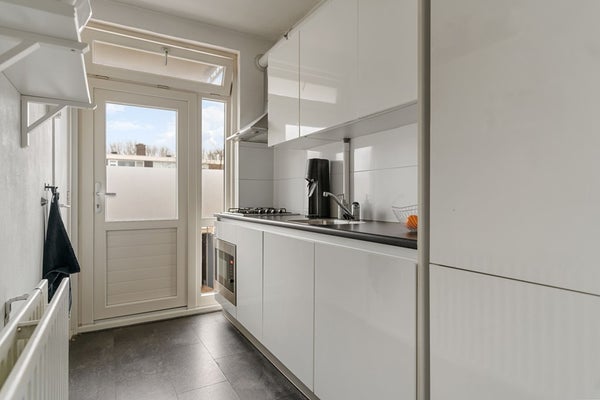 De keuken is voorzien van o.a. een wasbak, vierpits-gasfornuis met afzuigkap, vaatwasser, koel-vriescombinatie, oven en voldoende kastruimte. Ook geeft de keuken toegang tot het tweede balkon gelegen op het zonnige westen. Vanuit de keuken is tevens de badkamer bereikbaar.