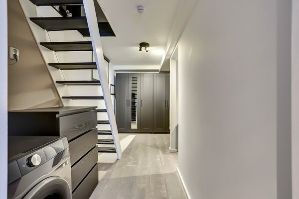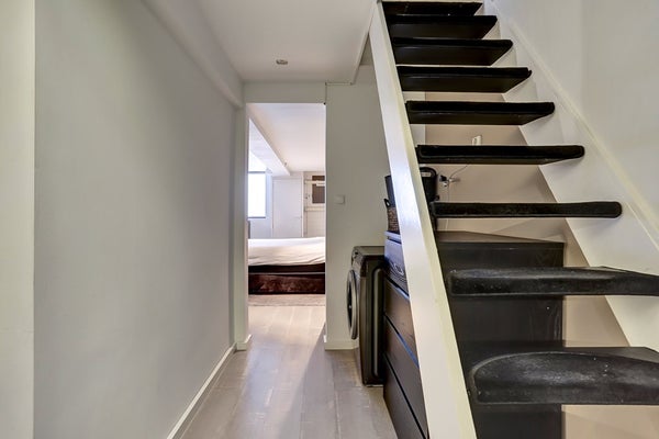 Gang met veel bergruimte en opstelplaats voor wasmachine en/of droger. Ruime en knusse slaapkamer door de lagere plafondhoogte en met toegang tot de tuin. Mogelijkheid voor het creëren van een tweede slaapkamer.