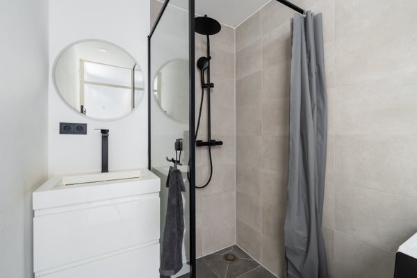 De in 2021 vernieuwde badkamer beschikt over een luxe uitstraling door de industriële douchewand met regen/stortdouche en mooie betonlook tegels.