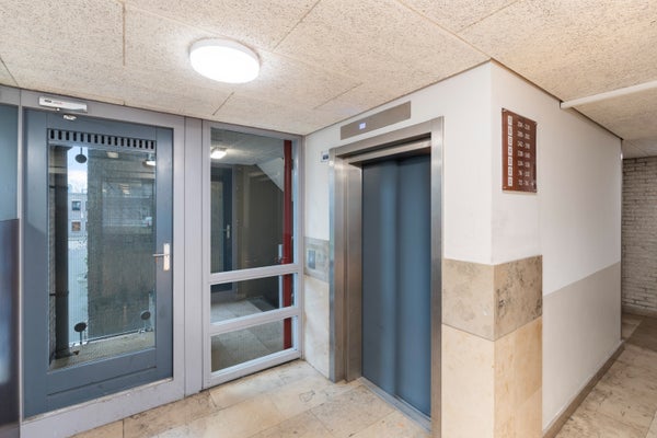 Afgesloten entree met videofoon bellentableau, brievenbussen en toegang tot de bergingen en de liftinstallatie.