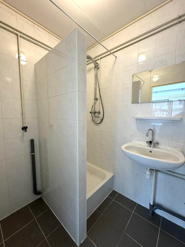 Aan de achterzijde bevinden zich twee slaapkamers van ca. 6 m² en 17 m². De grootste slaapkamer geeft direct toegang tot de badkamer, die is voorzien van een douche, wastafel en aansluiting voor de wasmachine.