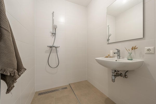 Verder is er een aparte wasruimte en de slaapkamer met een ensuite badkamer, voorzien van wand- en vloertegels, een wastafel, douche, designradiator en afzuigsysteem.