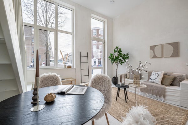 De woonkamer valt direct op door de hoge plafonds, het vele licht en de grote raampartijen. Op de begane grond is de aansluiting voor de keuken, klaar om naar eigen wens in te richten.