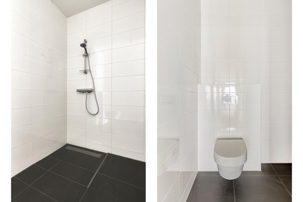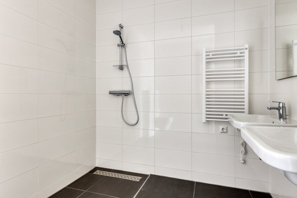 • De geheel betegelde badkamer is voorzien van een inloopdouche, dubbele wastafel, toilet en designradiator;