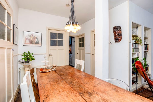 De lichte en ruime woonkamer is aan de voorzijde gelegen en heeft een open en ruimtelijk karakter, doordat de oorspronkelijke hal bij de woonkamer is betrokken. Hierdoor is er een royale zithoek ontstaan én volop ruimte voor een grote eettafel. De fraaie houten vloer en strakke wanden zorgen voor een moderne uitstraling met behoud van sfeer. De open inbouwkasten zijn ideaal voor het uitstallen van boeken en decoratieve items.
