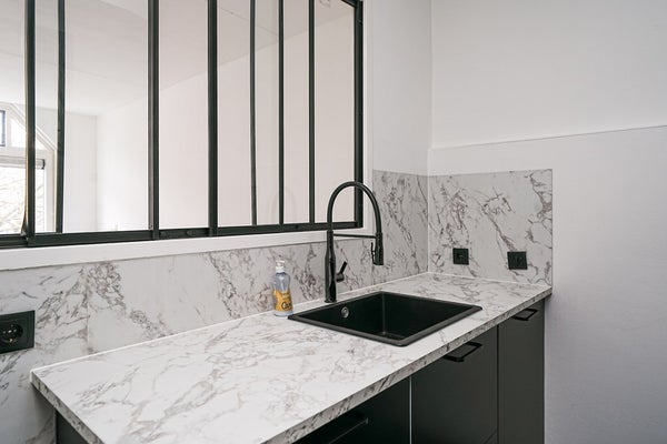 De luxe keuken is een echte blikvanger en van alle gemakken voorzien. De opstelling bestaat uit twee rechte delen en beschikt over diverse inbouwapparatuur, waaronder een oven, inductiekookplaat, vaatwasser en koelkast. De spoelbak met mengkraan is stijlvol geïntegreerd in het fraaie marmeren aanrechtblad met bijpassende achterwand. De zwarte keukenkasten, zwarte handgrepen en de zwarte tegelvloer geven het geheel een stoere, eigentijdse uitstraling. Het zwarte kozijnraam met zicht op de woonkamer zorgt voor een open karakter.