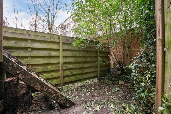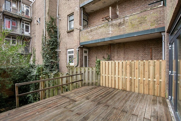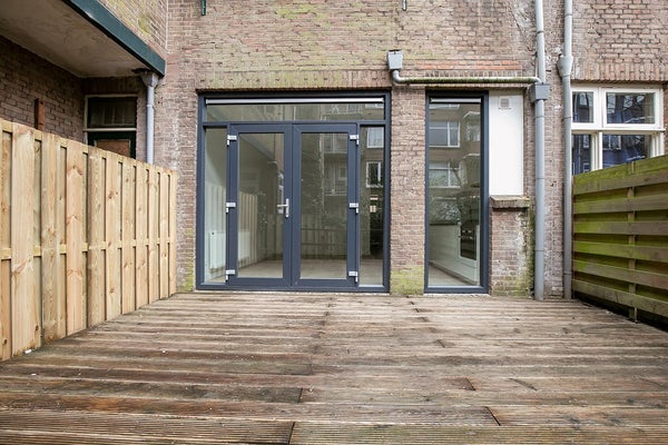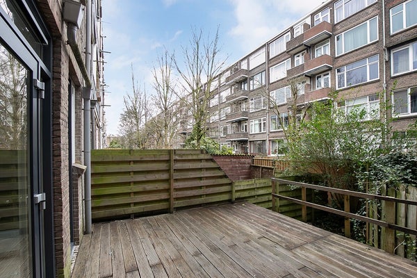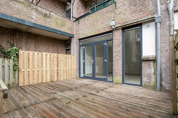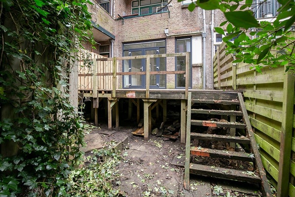 Vanuit de woonkamer is de buitenruimte bereikbaar. Hier bevindt zich een vlonderterras met daaronder een lager gelegen gedeelte van de tuin. Een fijne plek waar met gemak een gezellig terras kan worden gecreëerd.