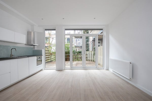 Aan het einde van de gang kom je in de lichte woonkamer met open keuken. De woonkamer heeft een prettige lichtinval dankzij de grote pui en beschikt over openslaande deuren naar de tuin. De keuken is praktisch opgesteld tegen de wand en voorzien van voldoende opbergruimte, een combi-oven, kookplaat en koel-vriescombinatie.