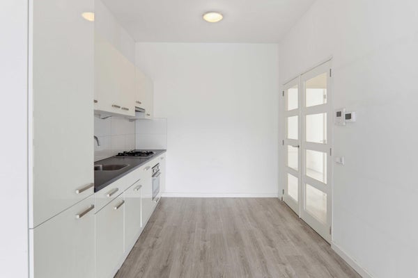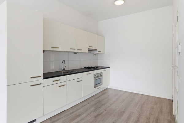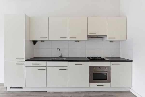 Hier bevindt zich ook de open keuken, praktisch en strak opgesteld met werkblad, inductie kookplaat, afzuigkap, oven, koelkast en spoelbak. Door de open verbinding met de woonkamer blijft het geheel licht en ruimtelijk.