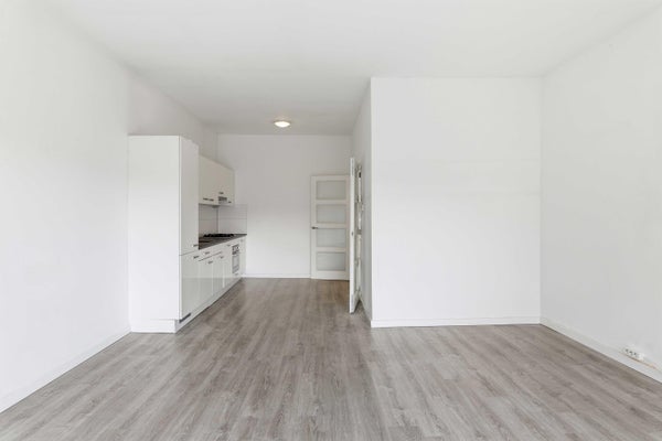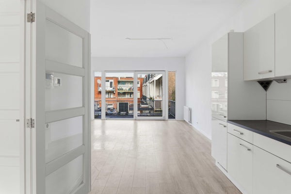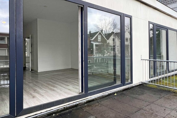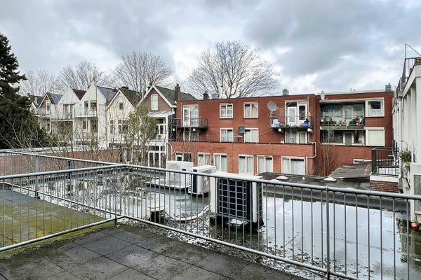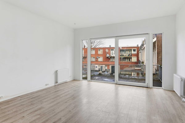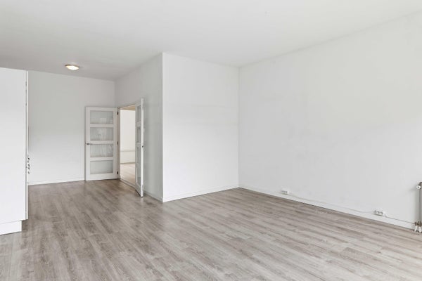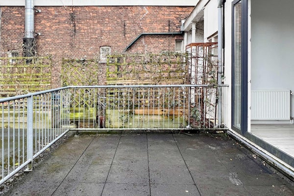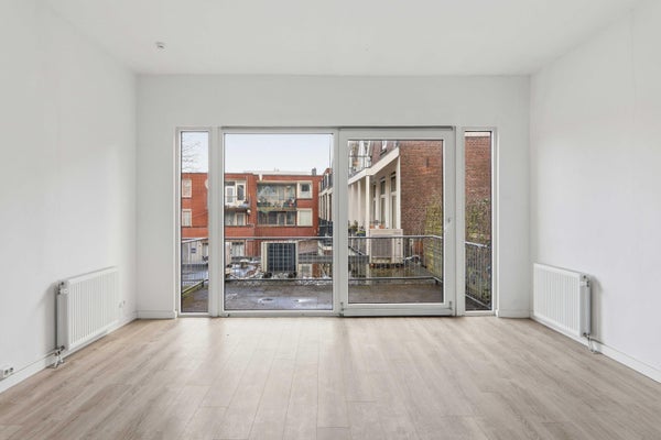 De woonkamer ligt aan de achterzijde en is opvallend diep en licht dankzij de grote raampartijen en de directe toegang tot het balkon. Hier kijk je uit over de binnentuinen — een heerlijk rustige plek midden in de stad.