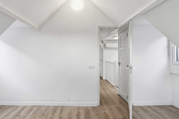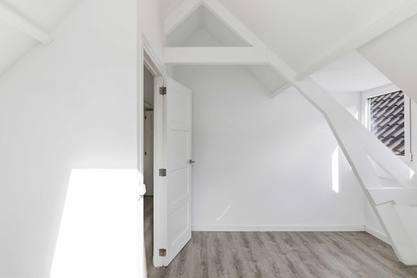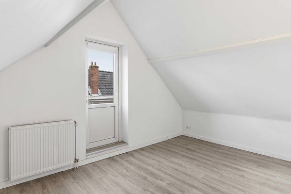 Hier bevinden zich twee ruime slaapkamers, beide met een prettige plafondhoogte en speelse daklijnen, wat zorgt voor extra karakter. De achterste slaapkamer heeft bovendien toegang tot een tweede balkon.