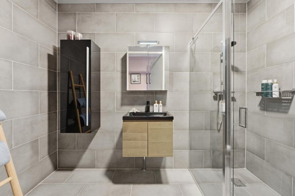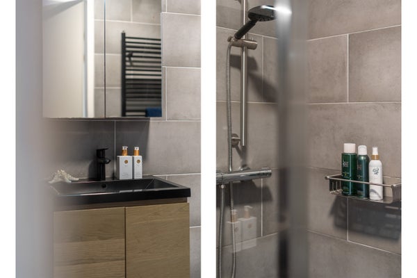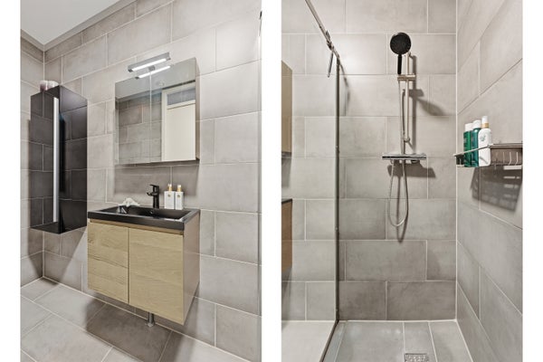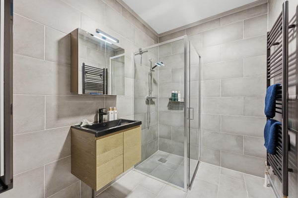 • Moderne badkamer (2017) met inloopdouche en stijlvol wastafelmeubel.