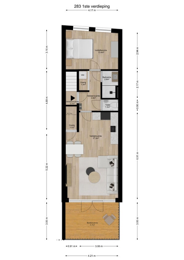- De bovenwoning heeft een woonoppervlakte van 51 m² en beschikt over 2 kamers, waarvan 1 slaapkamer;