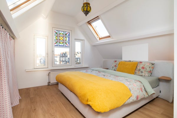 Slaapkamer (3.72 x 3.40) achter met velux-ramen en airco en toegang tot het tweede balkon (1.25 x 4.75) op het zuiden.