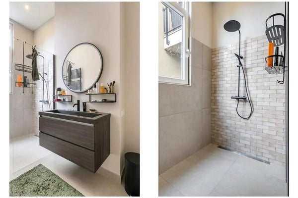 The luxurious bathroom at the rear was also fully renovated in 2023 and finished to a high standard. It features a spacious walk-in shower with rain shower, a wide washbasin with vanity unit, round mirror, designer tap and towel radiator.