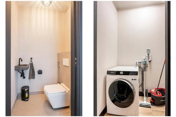The separate toilet is fitted with a wall-mounted toilet and small washbasin, and the internal storage room provides space for a washing machine and additional storage.