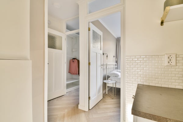 Links van de keuken een doorgang met een bergkast met de opstelplaats van de c.v.-ketel, Remeha uit 2019 en toegang tot de fraai ingerichte badkamer.
