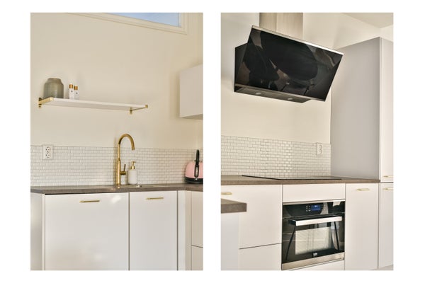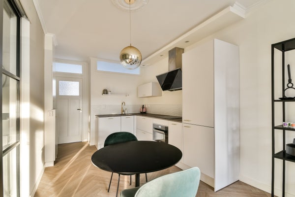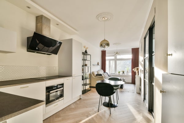 Tijdens de verbouwing is de locatie van de keuken verplaatst om zo een fijne open keuken te creeren. De keuken is in L-opstelling en past prachtig in de ruimte. De keuken is ingericht met een combi-magnetron/oven, inductie kookplaat, moderne afzuigkap, koel/vriescombinatie en vaatwasser.