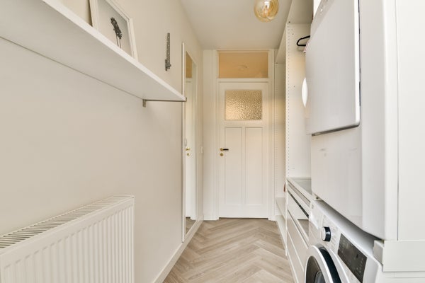 Strakke wanden, hoog plafond met ornamenten en op de vloer een prachtig in visgraad gelegde laminaatvloer, wat een binnenkomst! Ruim, sfeervol en heel veel lichtinval door de grote raampartij aan de voorzijde met vrij zicht op groen.