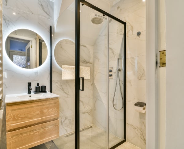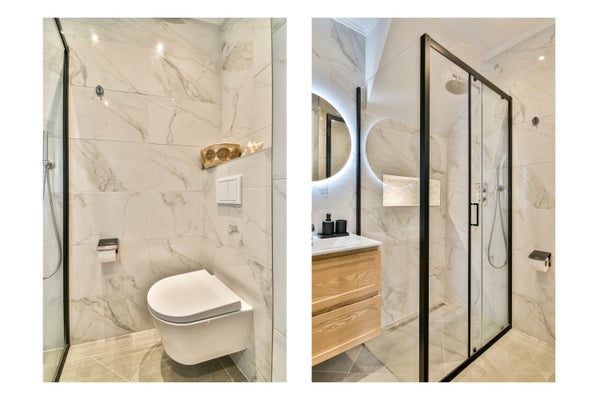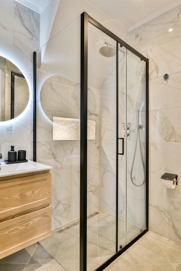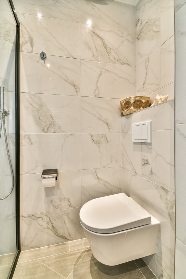 De geheel betegelde badkamer heeft een glazen inloopdouche, toilet inbouwspots en wastafelmeubel met spiegel en verlichting. De marmerlook tegels geven de ruimte een chique, tijdloze en luxe uitstraling.