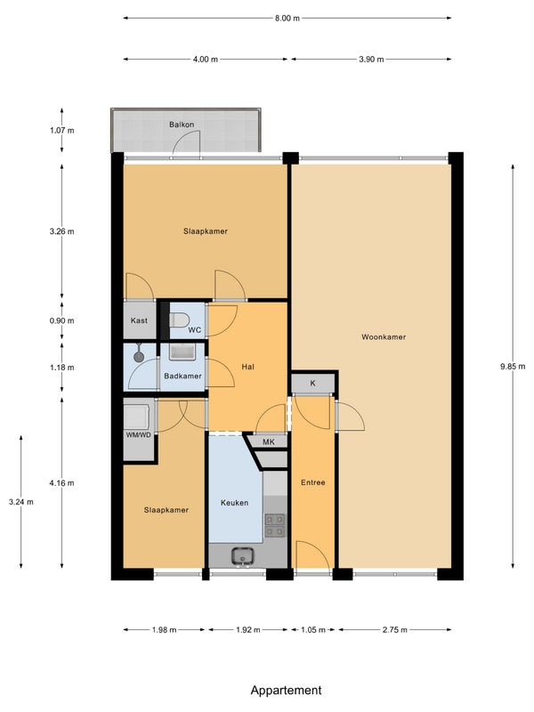 • De galerijflat heeft een woonoppervlakte van 79 m² en beschikt over 3 kamers, waarvan 2 slaapkamers;