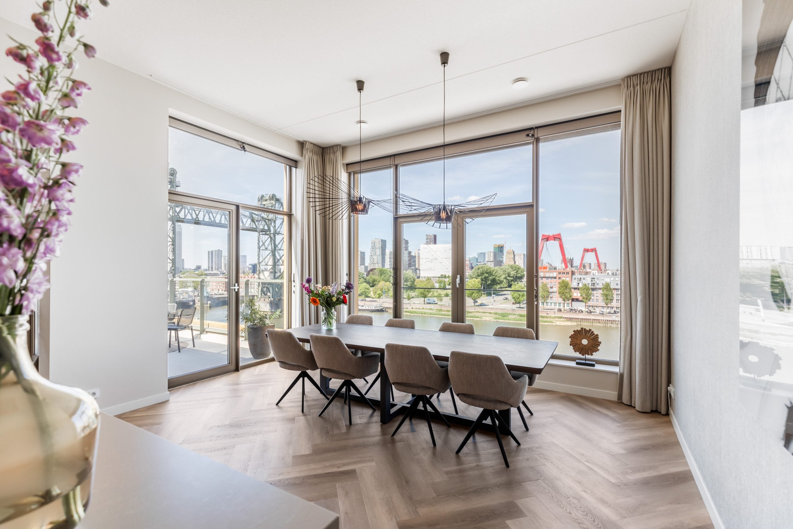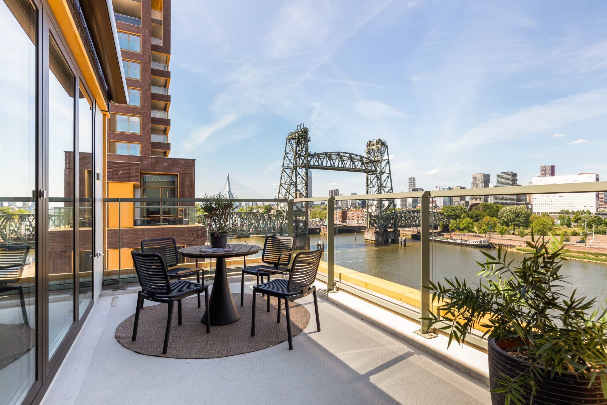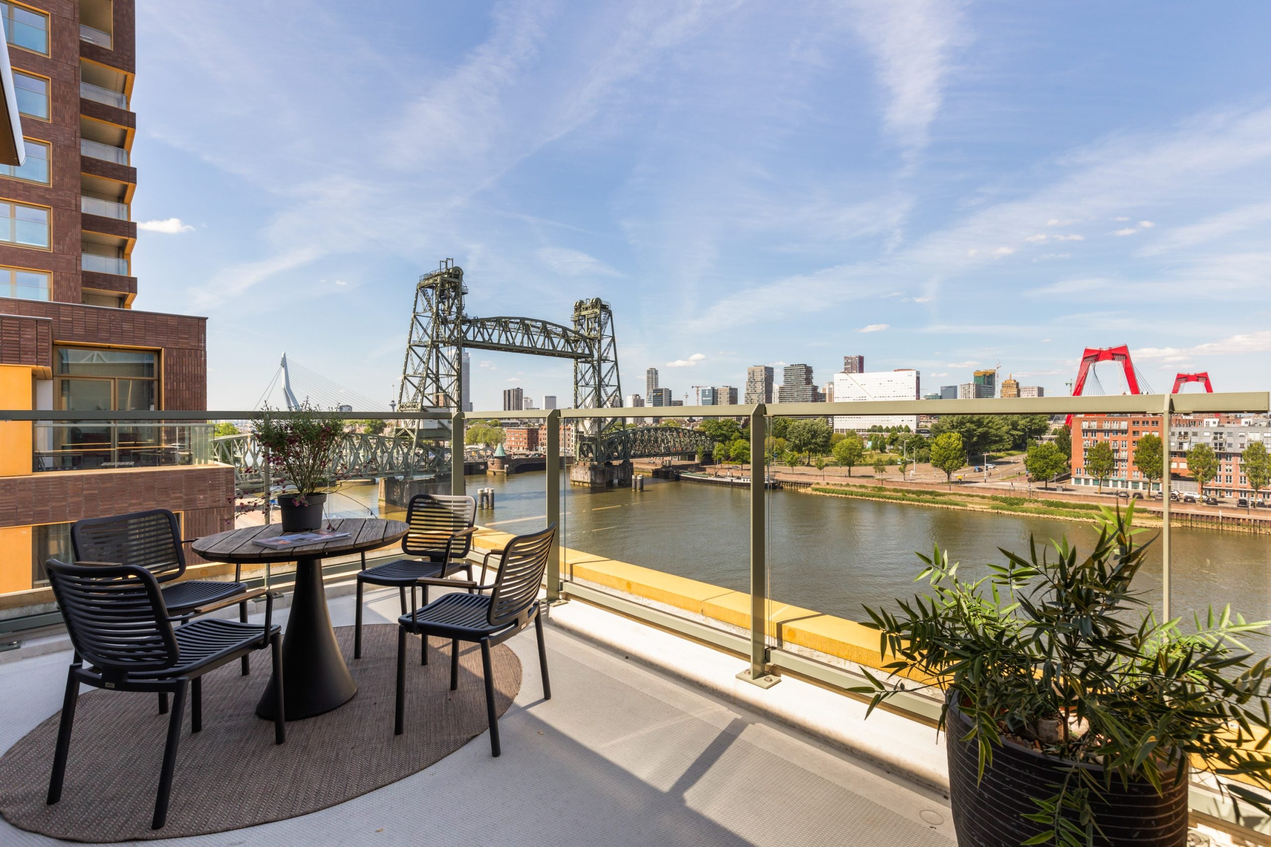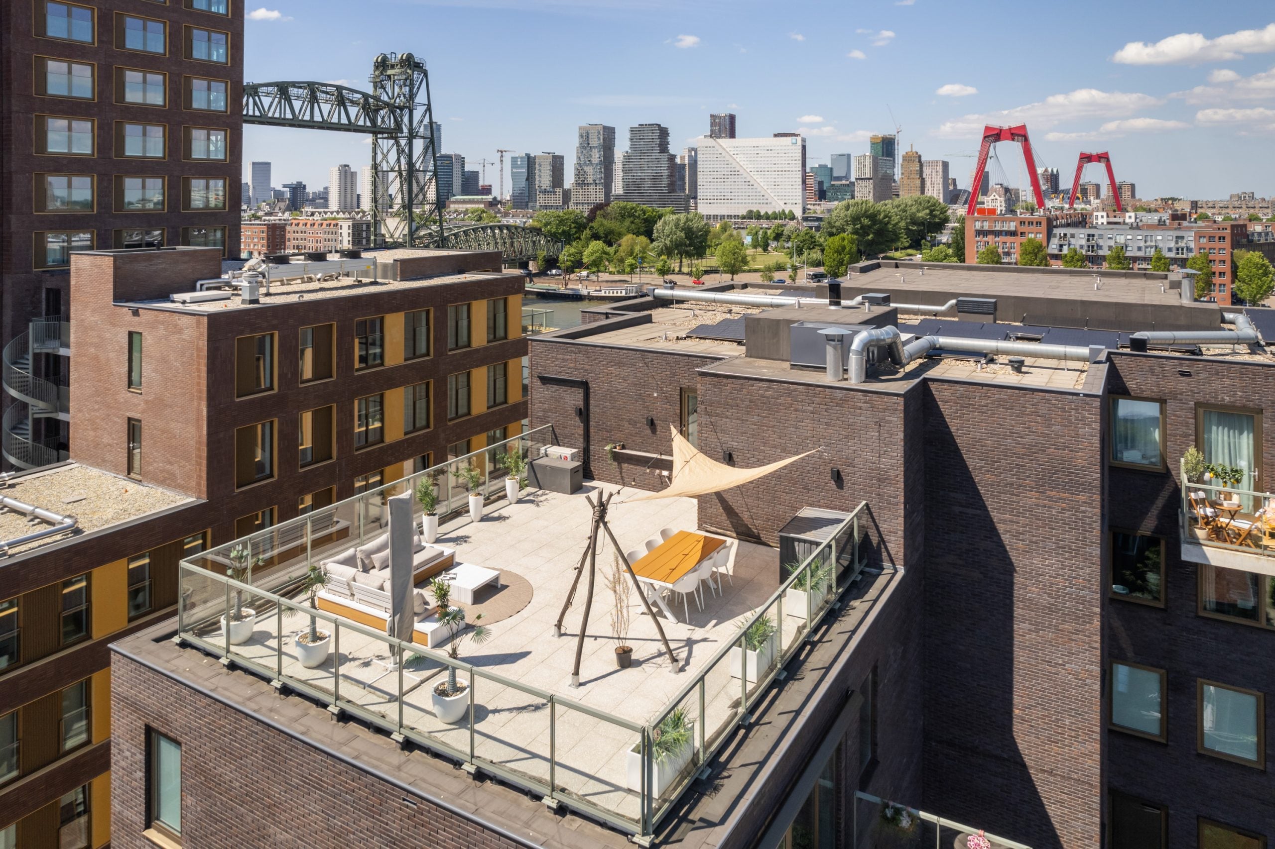 Dit fantastische 4/5-kamer penthouse van 141 m2 ligt op de Kop van Zuid en biedt een prachtig dakterras en balkon met uitzicht op de Maas. Gelegen op de bovenste verdieping, geniet je hier van de avonden met vrienden of familie in de bruisende sfeer van de stad. Het appartement beschikt over een eigen parkeerplaats in de afgesloten parkeergarage en een ruime berging. Met diverse voorzieningen op loopafstand, zoals het Hefpark, het Entrepotgebouw en de iconische Kop van Zuid, is de locatie ideaal. De royale entree leidt naar een lichte woon-/eetkamer met een open keuken. De master bedroom heeft een eigen badkamer, terwijl de andere slaapkamers multifunctioneel kunnen worden ingericht. Het dakterras van 76 m2 biedt een prachtig uitzicht en een fijne plek om te ontspannen.