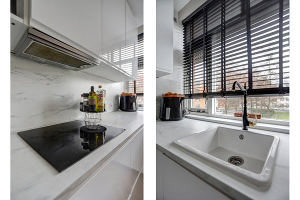 De moderne, witte L-vormige keuken is uitgerust met inbouwapparatuur, zoals een afzuigkap, vaatwasser en aansluiting voor de wasmachine.