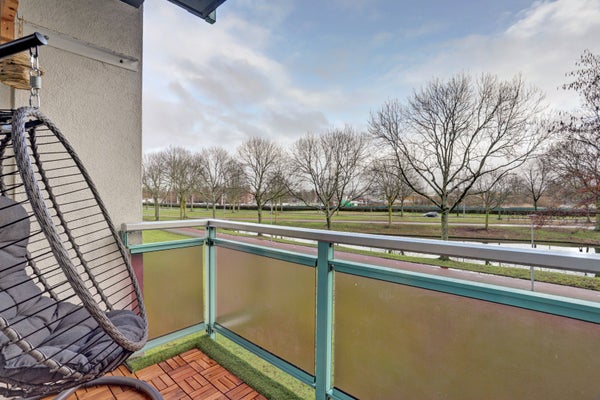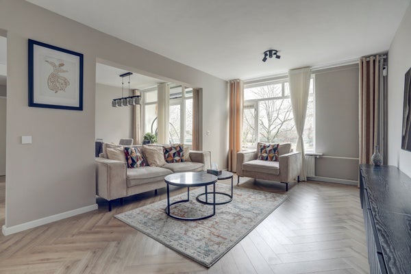 De strak afgewerkte woonkamer en eetkamer vormen samen een royale, open living van 21 m², met een fraaie visgraatvloer en veel daglicht dankzij de grote raampartijen. Vanuit de living stapt u zo het balkon op, gelegen op het oosten, met een groen uitzicht.