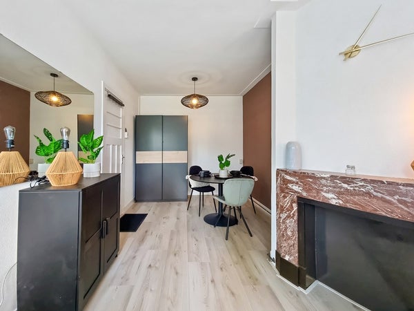 De woonkamer is gelegen aan de voorzijde en is licht en verzorgd afgewerkt. De ruimte is voorzien van een lichte houtlook laminaatvloer en strak wit afgewerkte wanden, wat zorgt voor een rustige en neutrale basis. Er is voldoende ruimte voor zowel een comfortabele zithoek als een eethoek.