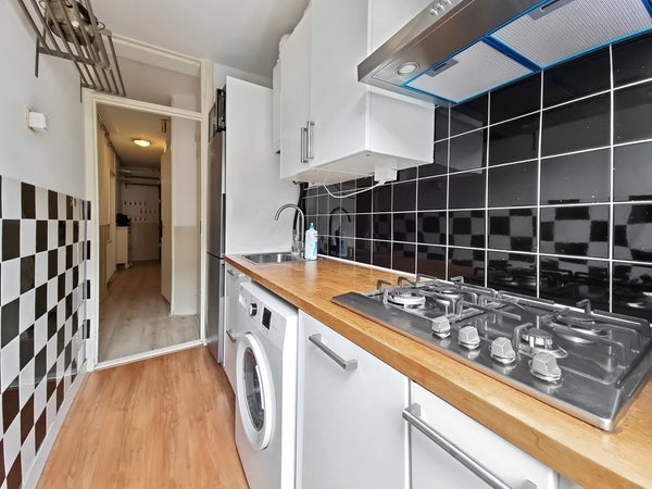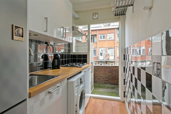 Aangrenzend bevindt zich de keuken, uitgevoerd in een witte kleurstelling met een houtkleurig werkblad. De keuken is praktisch ingedeeld en voorzien van diverse inbouwapparatuur, waaronder een 4-pits gaskookplaat, afzuigkap, spoelbak, koelkast en wasmachine-aansluiting.