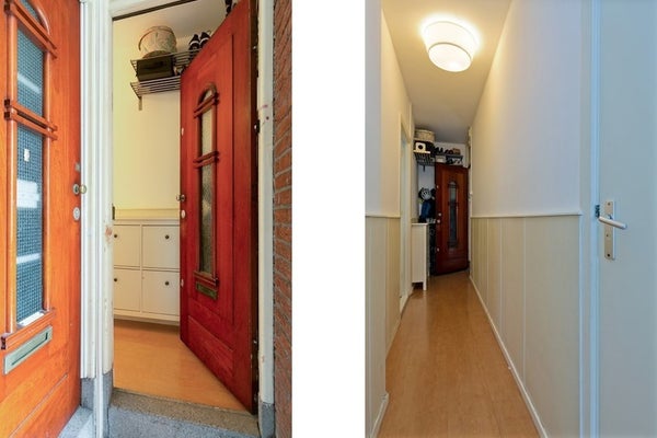 Via een gezamenlijk opstapje bereikt men de voordeuren, waarna toegang tot de eigen entree van het appartement. Binnenkomst in de gang met toegang tot alle vertrekken.