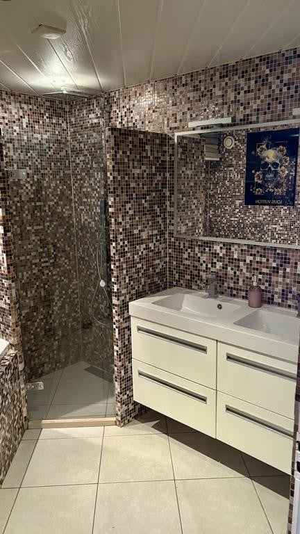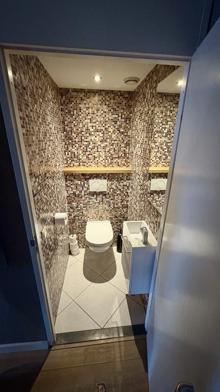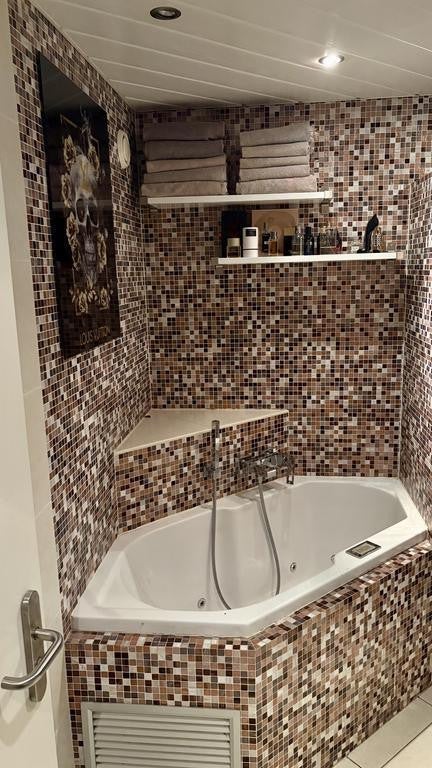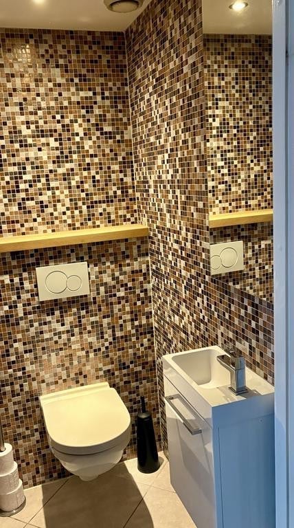 De badkamer is volledig betegeld en uitgevoerd in een luxe, comfortabele stijl. Hier beschik je over zowel een ligbad als een ruime inloopdouche, waardoor de ruimte aanvoelt als een privé wellness.