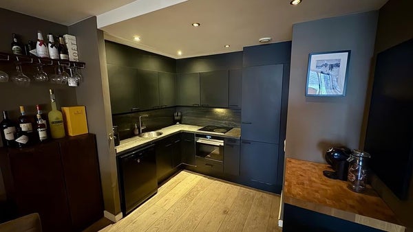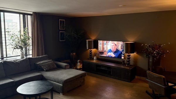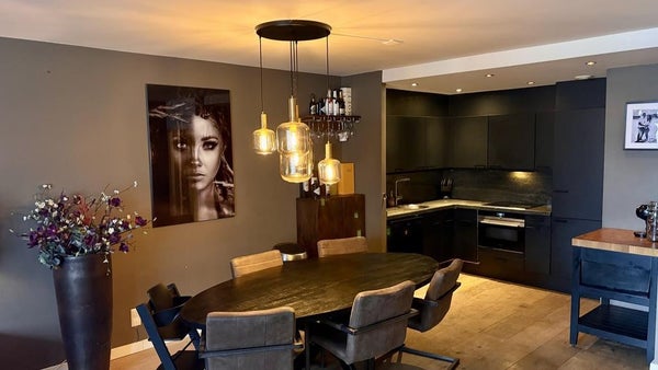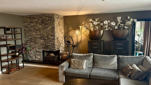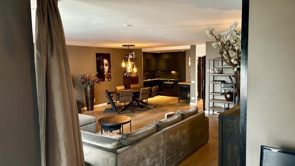 De royale woonkamer vormt het kloppend hart van het appartement. Grote raampartijen zorgen voor een overvloed aan natuurlijk daglicht en versterken het ruimtelijke karakter van de woning. Het uitzicht over de stad geeft de woonkamer een dynamische, bijna loftachtige sfeer. De open haard voegt warmte en elegantie toe en maakt de ruimte ideaal voor zowel ontspannen avonden als stijlvolle ontvangsten.