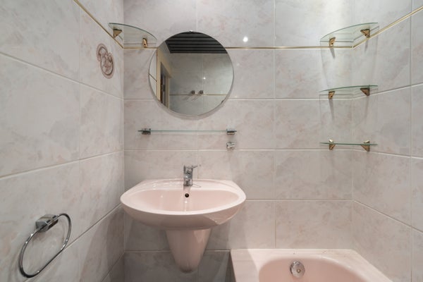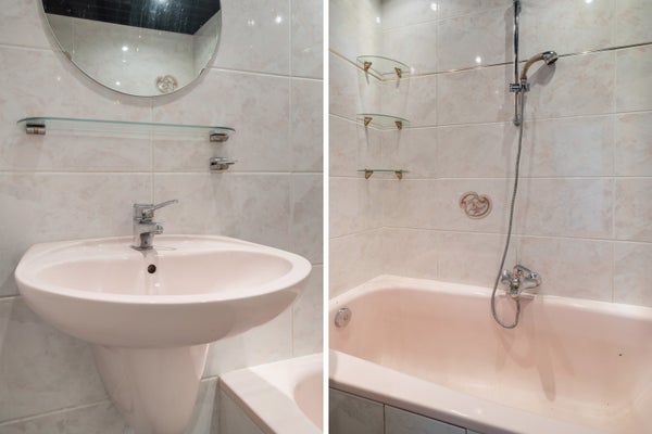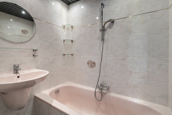 - De volledig betegelde badkamer is voorzien van een ligbad en een wastafel.