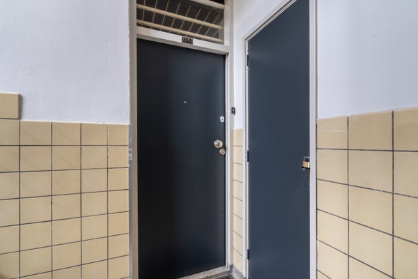 - Gesloten portiek met brievenbussen, toegang tot de berging en trapopgang naar de eerste verdieping.