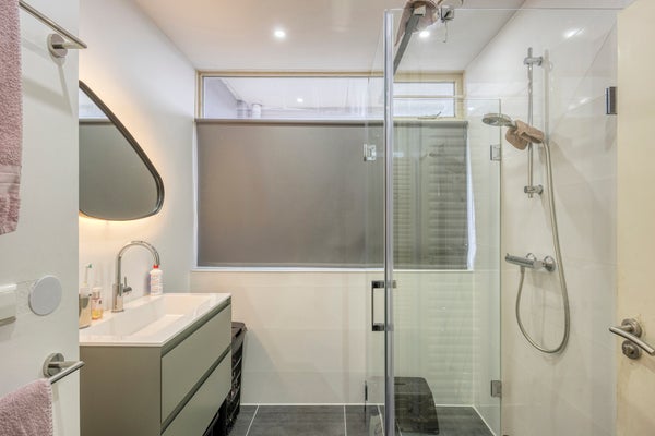 Een verzorgde badkamer van circa 4 m², voorzien van douche en wastafelmeubel in 2025 vernieuwd.