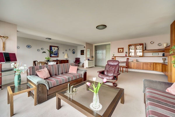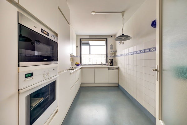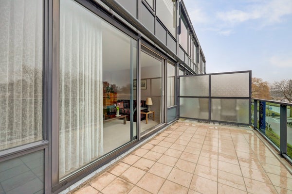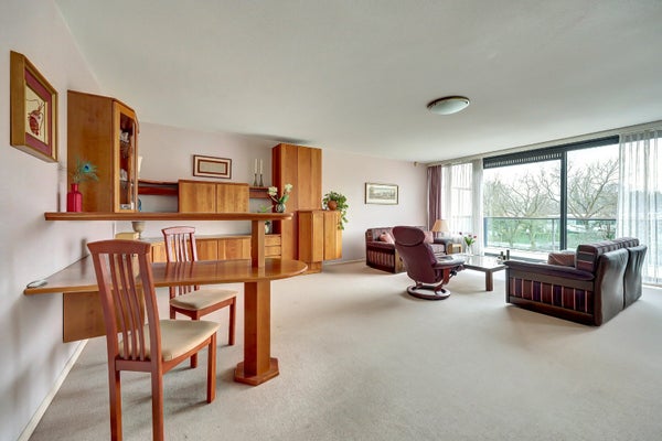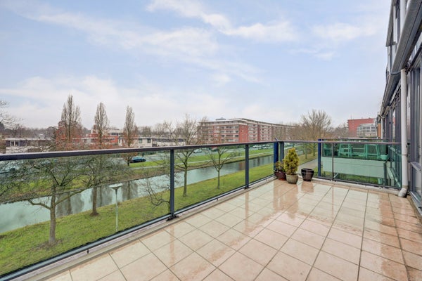 De aan de singelzijde gelegen royale woonkamer van bijna 8 meter breed heeft dankzij de grote raampartijen een prachtige zicht en lichtinval. Het zonnige balkon van bijna 15 m2 is via een aluminium schuifpui bereikbaar. Hier kunt u volop genieten tot de zonsondergang én van het uitzicht. Een heerlijke plek om tot rust te komen of om gezellig te borrelen met vrienden en familie.