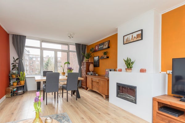 De woonkamer is ruim opgezet en beschikt over grote raampartijen aan beide zijden. Aan de voorzijde kijkt u vrij uit over de Gordelweg en het Noorderkanaal, terwijl u aan de achterzijde uitzicht heeft op de groene binnentuinen. De overvloedige lichtinval zorgt voor een fijne, open sfeer. Er is volop ruimte voor zowel een comfortabele zithoek als een gezellige eethoek.