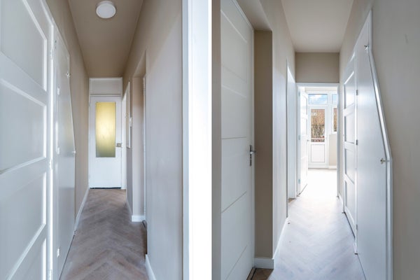 Entree, trapopgang, lange gang met toegang tot alle vertrekken en trap naar de kelder. Zijkamer aan de achterzijde met balkon.