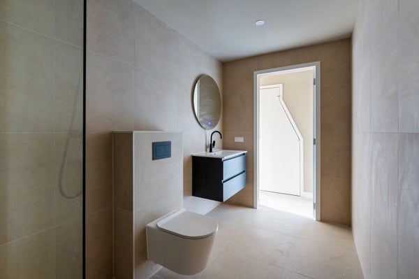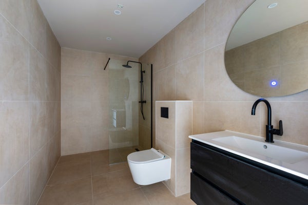 Luxe badkamer met inloopdouche, wastafelmeubel en toilet