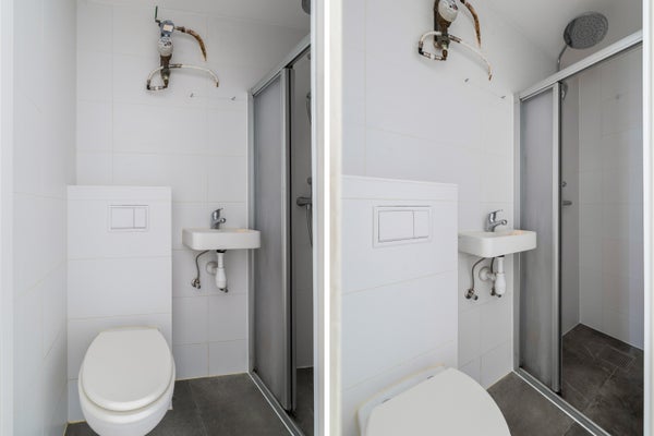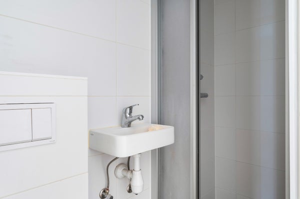 In de gang bevindt zich de net betegelde badkamer met een inloopdouche, toilet en een wastafel.