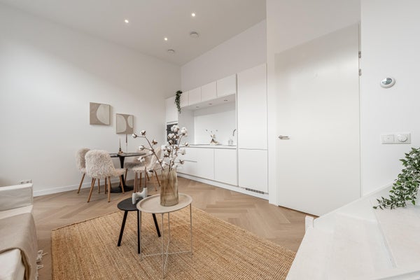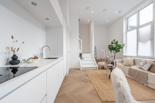 Via de entree stap je direct de leefruimte binnen. De woonkamer valt meteen op door de plafondhoogte van circa 3,5 meter en de grote raampartijen die zorgen voor een prachtige lichtinval en een ruimtelijk gevoel. De ruimte is afgewerkt met een hoogwaardige visgraat PVC-vloer en dimbare LED-spots, wat zorgt voor een moderne en sfeervolle uitstraling.