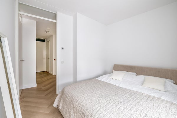 Op deze verdieping bevinden zich twee slaapkamers. De eerste slaapkamer is gelegen aan de voorzijde en is, net als de rest van de woning, afgewerkt met een hoogwaardige visgraat PVC-vloer. Dankzij het Franse balkon en de prettige lichtinval is dit een volwaardige kamer die zich uitstekend leent als master bedroom. De tweede slaapkamer beschikt eveneens over dezelfde visgraat PVC-vloer en biedt toegang tot een ruim balkon op het zuidoosten. Een heerlijke plek om buiten te zitten en ideaal als slaap-, werk- of logeerkamer.