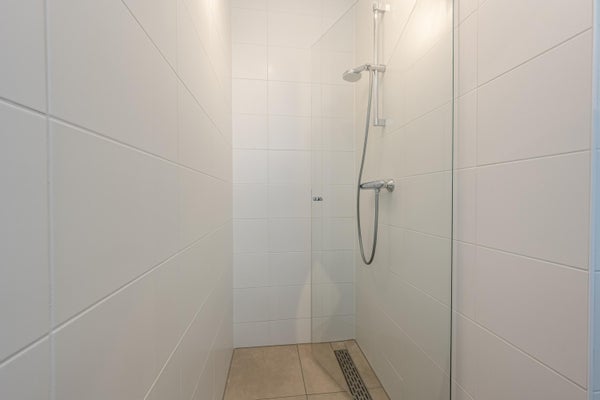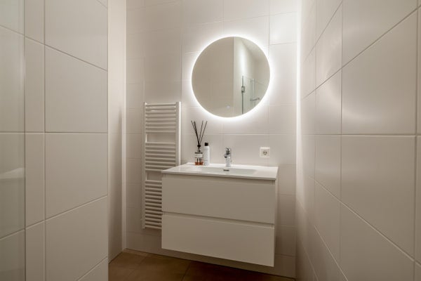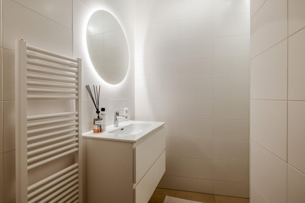 De badkamer is modern afgewerkt en voorzien van wand- en vloertegels, een wastafelmeubel, verlichte spiegel, designradiator en een inloopdouche.