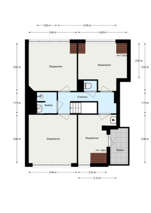 Via een interne trap kom je op de derde verdieping, waar zich vier slaapkamers, een badkamer en een tweede toilet bevinden. De slaapkamers variëren in grootte van circa 10, 11, 13 en 14 m². De badkamer (ca. 3 m²) is voorzien van een douche, wastafel en designradiator. Vanuit één van de slaapkamers heb je toegang tot het tweede balkon van circa 6 m².