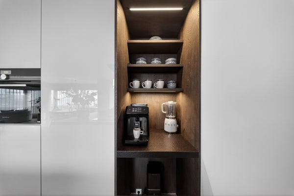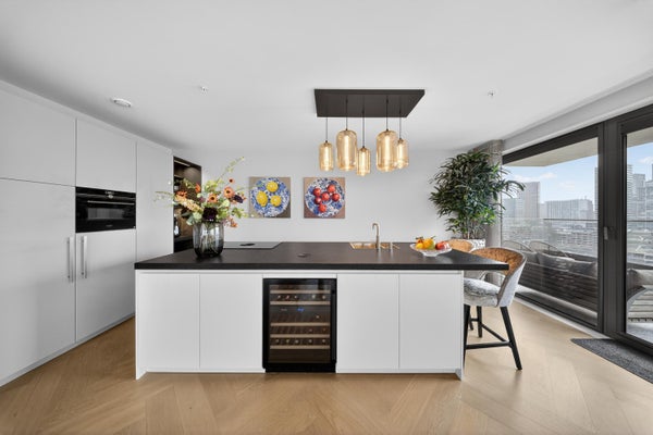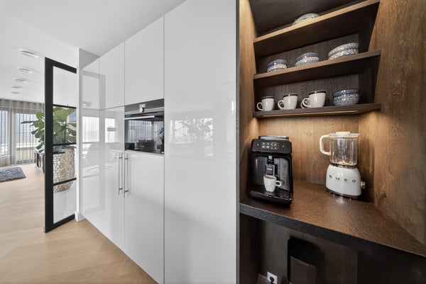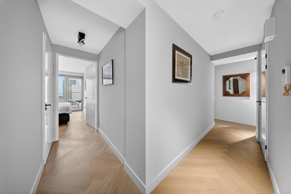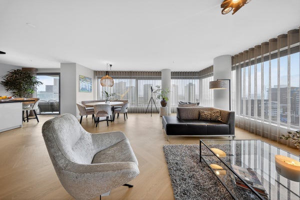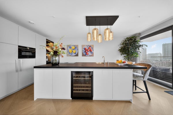 Entree van de woning met garderobe, videofoonsysteem, toilet en gang met toegang tot alle vertrekken. De royale living is door de grote raampartijen heerlijk licht en biedt van ’s ochtends vroeg tot ’s avonds laat spectaculaire uitzichten. Hier bevindt zich ook de open keuken, uitgevoerd met een kastenwand en kookeiland en ingericht met alle benodigde inbouwapparatuur, waaronder een 4-pits keramische kookplaat met Bora-afzuiging, koelkast, vriezer, combi-oven, vaatwasser, Quooker en wijnklimaatkast. Vanuit de woonkamer en keuken is toegang tot de twee ruime balkons.
