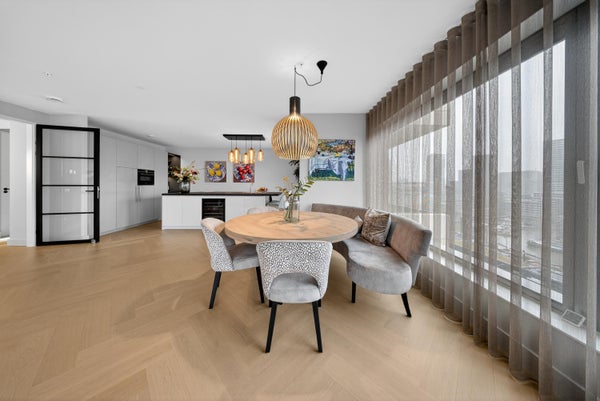 Het gehele appartement is uitstekend geïsoleerd en voorzien van vloerverwarming én vloerkoeling gedurende de warme maanden, hoge plafonds, visgraat eikenhouten vloer, gestucte wanden en plafonds, grote raampartijen en een serene, luxe sfeer.